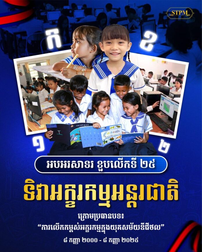 (ភ្នំពេញ)៖ សម្តេចបវរធិបតី ហ៊ុន ម៉ាណែត នាយករដ្ឋមន្ត្រីនៃកម្ពុជា នៅព្រឹកថ្ងៃទី៨ ខែកញ្ញា ឆ្នាំ២០២៥នេះ បានអបអរសាទរ ខួបលើកទី២៥ ទិវាអក្ខរកម្មអន្តរជាតិ ក្រោមប្រធានបទ «ការលើកកម្ពស់អក្ខរកម្ម ក្នុងយុគសម័យឌីជីថល» ។